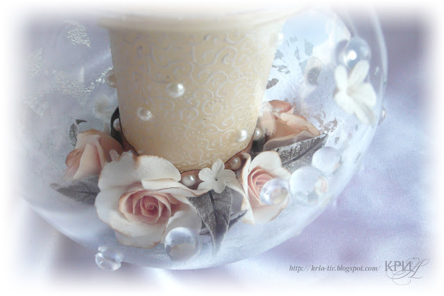 Низ шара я сделала не прозрачным (как и на бокалах). Сама свеча расписана перламутровым контуром. Очень пригодились стеклянные прозрачные шарики. Они придают легкость и воздушность.